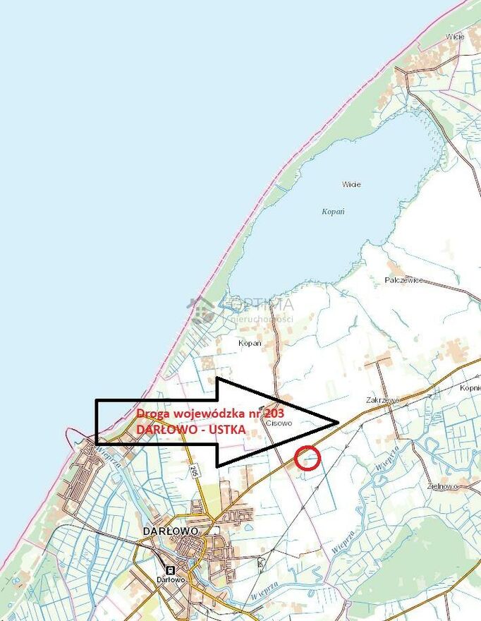 Działka inwestycyjna położona w Cisowie oddalonym zaledwie o 1 km od Darłowa i tylko 3 km od morza i Jeziora Kopań. Nieruchomość położona przy drodze DW 203 łączącej Ustkę z Darłowem.W okolicy zabudowania mieszkalne.